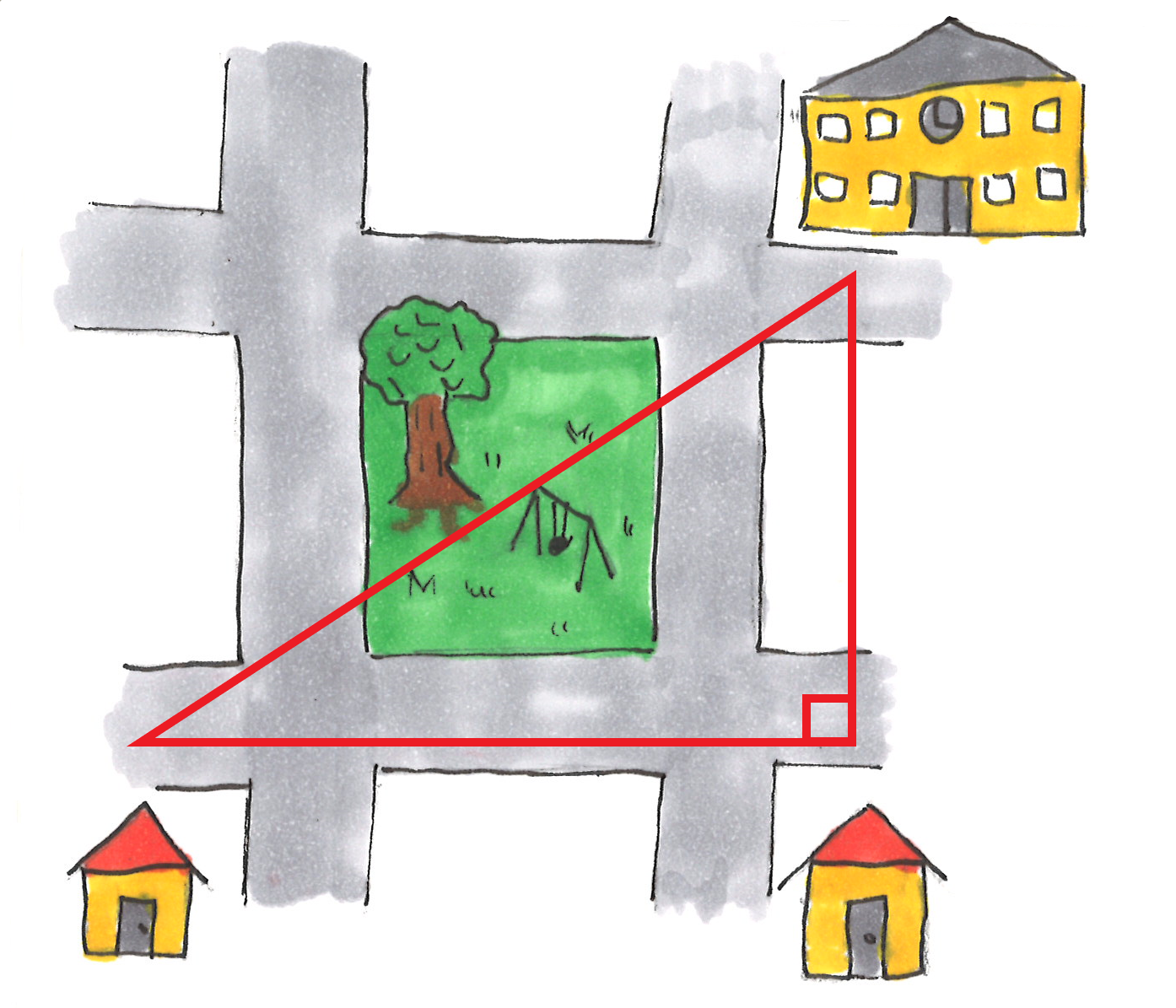 Pytagoras i praksis 2: Spor I SPOR I Oppgave 1 Charlie bor 2 km unna en klassekamerat langs en rett strekning. Derfra er det 1 km til skolen. Bruk Pytagoras’ setning og hjelp Charlie til å finne ut hvor mange meter han sparer på skoleveien dersom han tar snarveien gjennom parken. Se fasit Pytagoras 2: Spor IV – fasit Pytagoras i praksis 2: Spor II Legg igjen en kommentar Avbryt svarDin e-postadresse vil ikke bli publisert. Obligatoriske felt er merket med *CommentName* Email* Website Save my name, email, and site URL in my browser for next time I post a comment. Δ